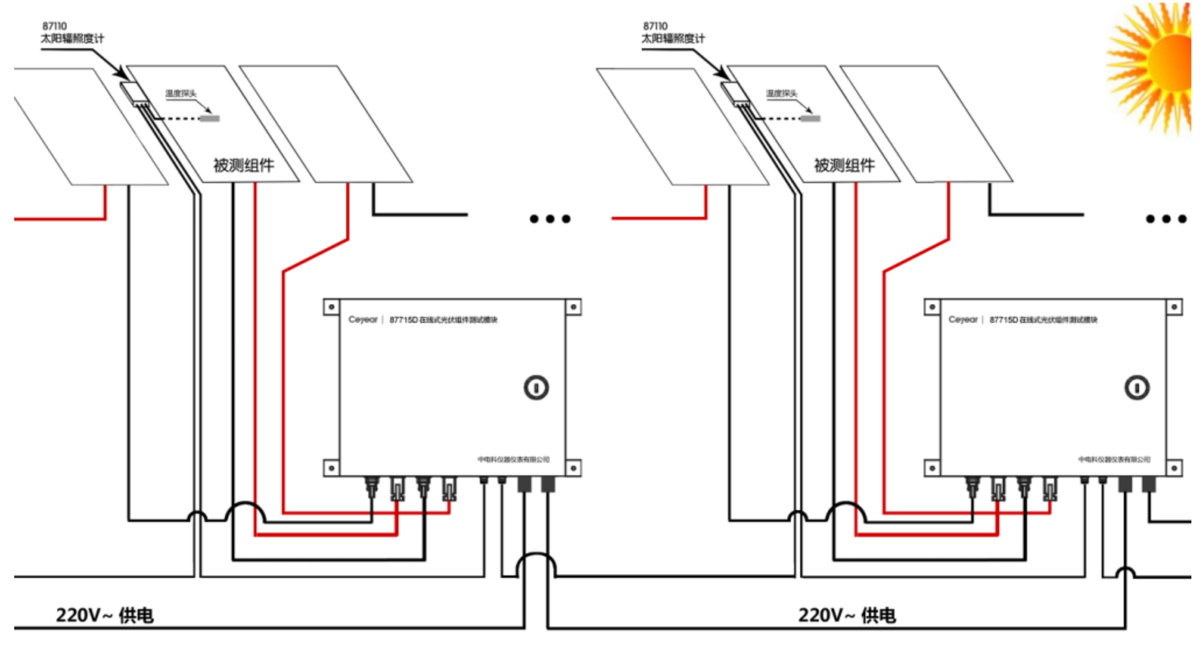 - 支持87110B太陽輻照度計一同組網,實現對被測組件輻照度、溫度的監測。