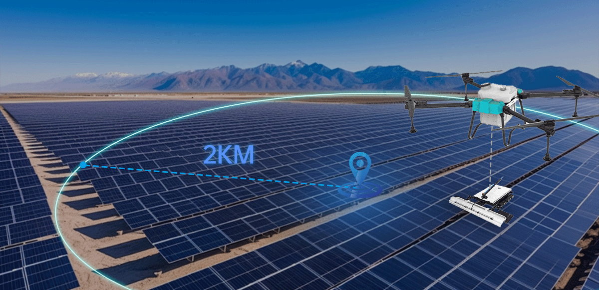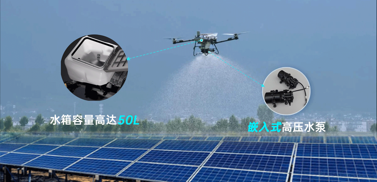 LX360SX高壓360°循環噴頭,光伏電站現場安全避障,三?魚眼視覺避障。 2個??魚眼攝像頭+FPV攝像頭,通過視覺融合算法與雷達協同合作,提?仿地繞?效果。